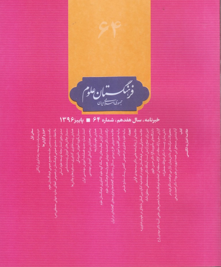 شصت و چهارمین شماره نشریه فرهنگستان علوم (ویژه پاییز 1396) با سرمقاله آقای دکتر رضا داوری اردکانی تحت عنوان «خردِ پیشرفت و توسعه» منتشر شد. در این شماره، اخبار و گزارش فعالیت های فرهنگستان علوم در سه ماهه اخیر به چاپ رسیده است. گزارش یکصد و بیستمین جلسه مجمع عمومی فرهنگستان، ملاحظات مجمع عمومی فرهنگستان درخصوص اعطای جایزه جهانی مصطفی(ص)، گزارش سمینار چالش های آموزش زیست شناسی، گزارش همایش زیست فناوری کشاورزی: دستاوردها و چالش ها، گزارش سمینار یکروزه آموزش دامپزشکی، گزارش پنجمین همایش بین المللی آموزش مهندسی، گزارش همایش علوم یکپارچه، گزارش کنفرانس بین المللی تحقیقات لُس، 2017، خلاصه مدیریتی طرح بررسی مسائل و مشکلات گلخانهها و فراوردههای گلخانهای در ایران، بیانیه تغییر اقلیم و آموزش، بیانیه علوم و فناوری درخصوص کاهش ریسک سوانح طبیعی، انتشار شماره جدید فصلنامه آموزش مهندسی ایران، انتشار گزارش عملکرد 25 ساله گروه علوم کشاورزی فرهنگستان علوم، و خبر درگذشت دکتر جمشید درویش عضو وابسته فرهنگستان علوم از جمله گزارش های چاپ شده در این شماره است.