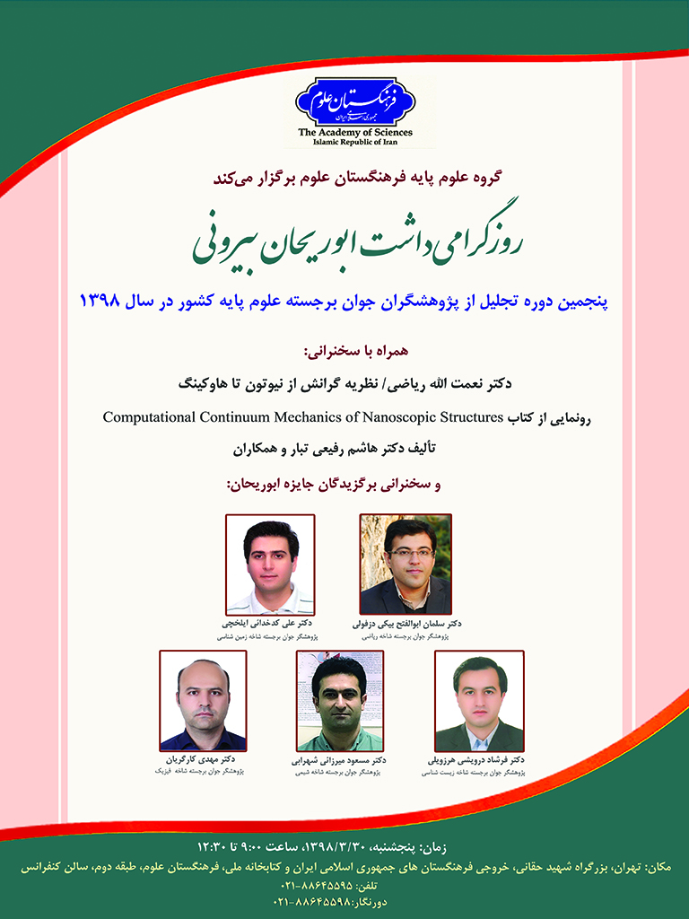 روز پنجشنبه 30 خرداد 98، پنجمین دوره گرامیداشت ابوریحان بیرونی و تجلیل از پژوهشگران جوان برجسته رشته های علوم پایه کشور، منتخب فرهنگستان علوم جمهوری اسلامی ایران  برگزار می شود.