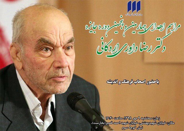 مراسم چهارمین و پنجمین دوره اهدای جایزه دکتر داوری در روز سهشنبه (نهم مهر ماه) ساعت ۱۶:۳۰ و با حضور هیات داوران و اصحاب فرهنگ و اندیشه در مرکز فرهنگی شهر کتاب واقع در خیابان شهید بهشتی، خیابان شهید احمد قصیر (بخارست)، نبش کوچه سوم برگزار میشود و ورود برای علاقهمندان آزاد است.