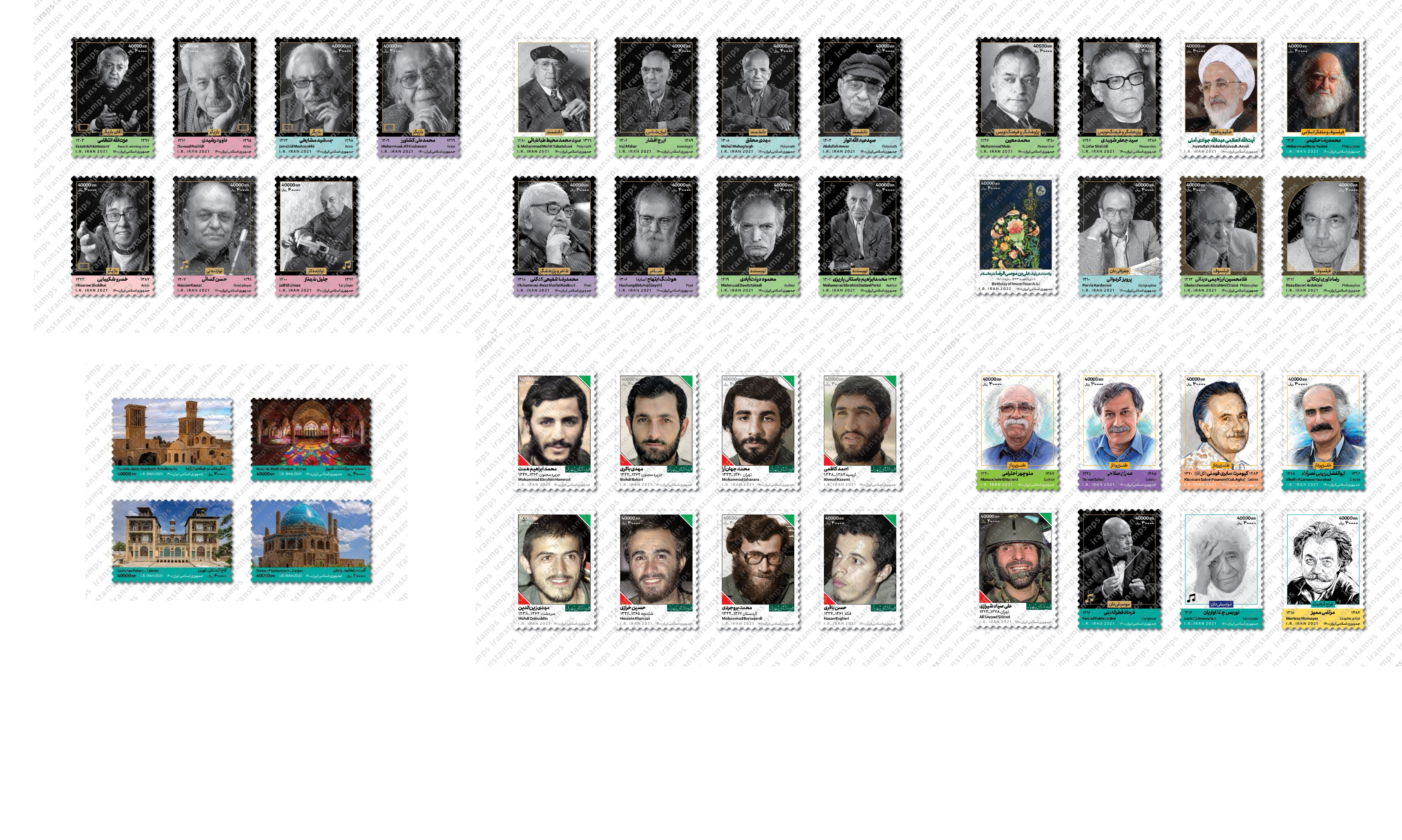 همچنین پرتره هشت نویسنده معاصر و درگذشته استادان: محمدعلی جمالزاده، جلال‌الدین همایی، عبدالحسین زرین‌کوب، عباس زریاب‌خویی، ابوالقاسم گرجی، یحیی مهدوی و نجف دریابندری؛ و نویسنده در قید حیات استاد احمد مهدوی دامغانی نیز جزو تمبرهای این مشاهیر قرار گرفته است.