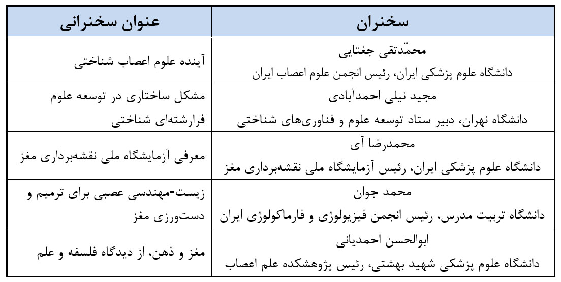 این وبینار به منظور روشنشدن ابعاد رشد بسیار سریع دانش و فناوریهای علوم اعصاب و شناختی و علوم وابسته در دنیا و تبیین جایگاه ایران و بررسی راهکارهای کم کردن فاصله موجود بین کشور ایران و کشورهای پیشرو در دنیا برگزار شد. تعداد پنج نفر از پژوهشگران و مدیرانی که در سالهای اخیر در تحقیقات، راهبری و سیاستگذاری در این رشته فعال بوده و هستند به شرح جدول زیر در این وبینار سخنرانی کردند و در پایان در میزگرد مجازی، سخنرانان به سؤالات شرکتکنندگان پاسخ دادند و به همفکری در مورد مشکلات موجود و راهکارهای رفع موانع موجود پرداختند.