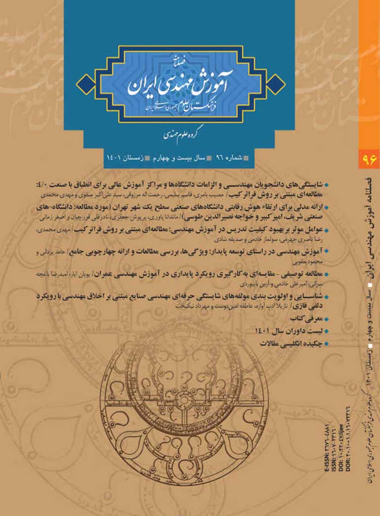 - مطالعه توصیفی- مقایسه ای به کارگیری رویکرد پایداری در آموزش مهندسی عمران/ پویان ایار استادیار دانشکده مهندسی عمران دانشگاه علم و صنعت ایران؛ امیدرضا باغچه سرایی دانشـجوی دکتـری مهندسـی سـازه، مرکـز تحقیقـات مهندسـی زیرسـاخت، دانشـکده مهندسـی، طراحـی و سـاخت محیـط، دانشـگاه سـیدنی غربی؛ امیرعلی خادمی و آرین بایبوردی به ترتیب: دانشجوی کارشناسی و دانش آموخته کارشناسی مهندسی عمران دانشکده مهندسی عمران دانشگاه علم و صنعت ایران