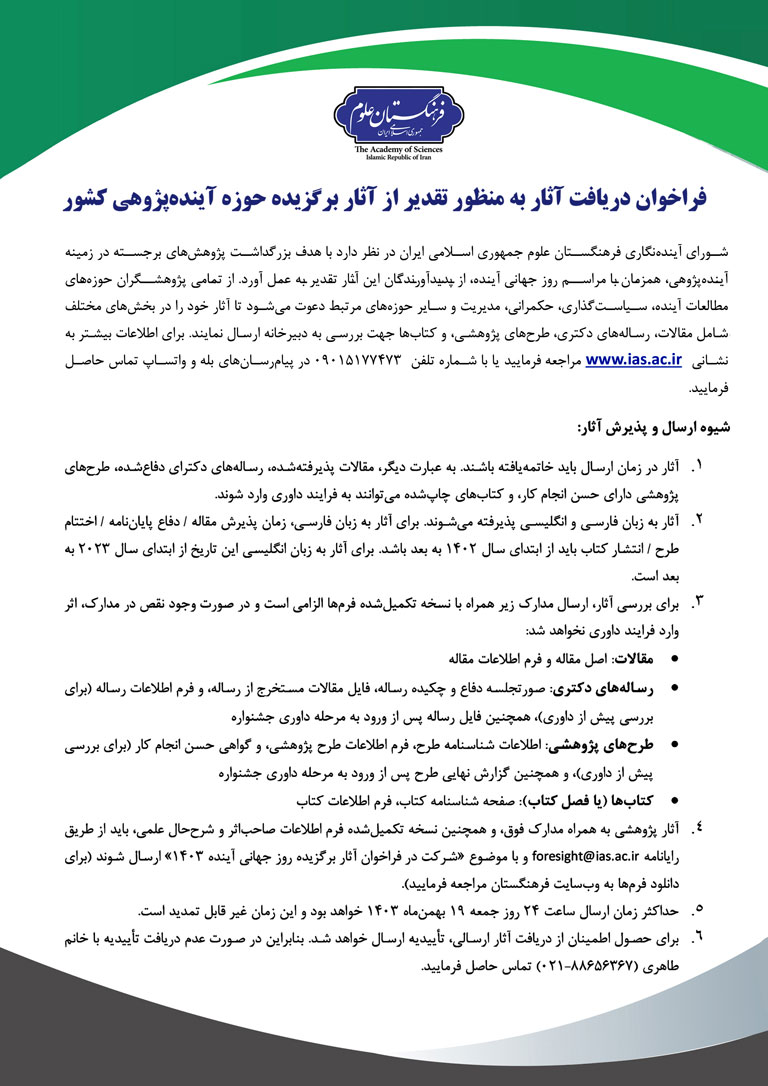 شورای آیندهنگاری فرهنگستان علوم جمهوری اسلامی ایران در نظر دارد با هدف بزرگداشت پژوهشهای برجسته در زمینه آیندهپژوهی، همزمان با مراسم روز جهانی آینده، از پدیدآورندگان این آثار تقدیر به عمل آورد.